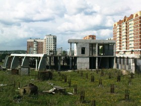 Недостроенное здание с видом на Первоуральский пруд. Сведений о назначении здания нет, но, судя по сложной архитектуре, это мог быть торговый центр. Забор вокруг стройки не препятствует попаданию на объект.