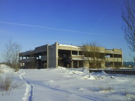 Большое здание, непонятного предназначения. Постройка выдаёт только то, что здание строилось для какого-то производства. Рядом с ним есть небольшой недострой, а так же заложены ещё 3 площадки (присутствует фундамент). Здание прилично захламлено.