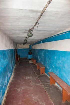 Отдельно стоящее убежище коридорного типа с 1 наклонником, 1979 года постройки. Состоит из небольшого коридора с лавочками, бочки ФВУ и туалета. Рассчитано до 50 укрывающихся. Внутреннее состояние хорошее.