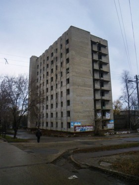 Состоит из 2-х девятиэтажных корпусов, соединённых между собой. Не достроено в связи с развалом СССР, из-за нехватки финансирования. Было почти полностью достроено, внутри была проводка, коммуникации, двери, окна. Есть выход на крышу и в подвал. Имеет 2 лестницы, одна из которых на переходе на этаж имеет выход из лифта. Мусора и граффити не много.