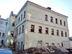 Трёхэтажное заброшенное здание с аркой, пострадавшее в начале 2000-х гг. от пожара. Покрыто зелёной сеткой.